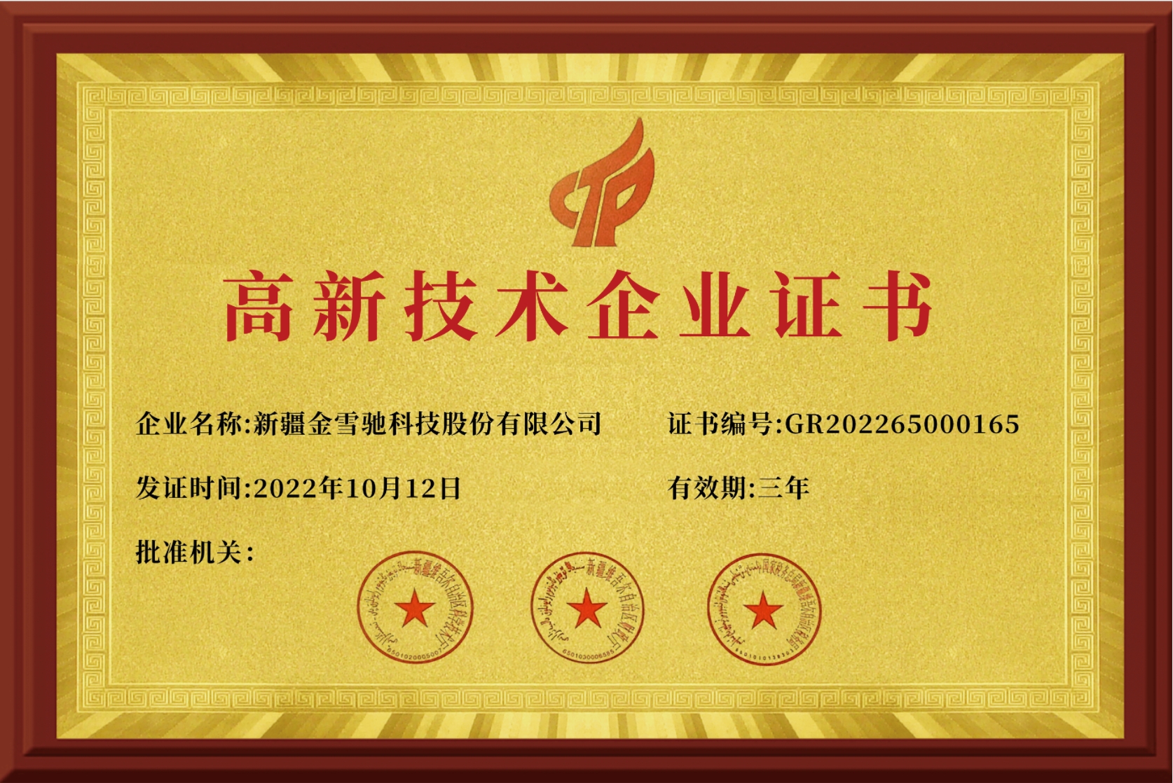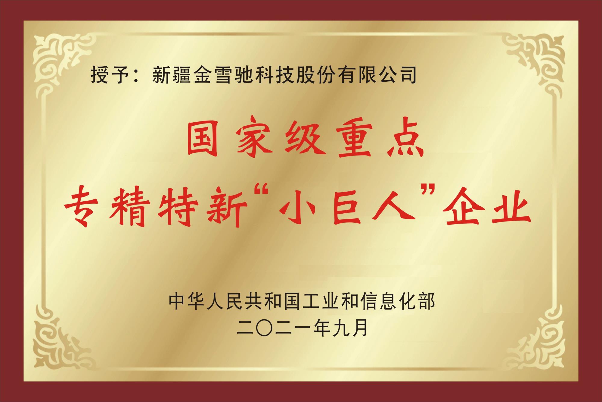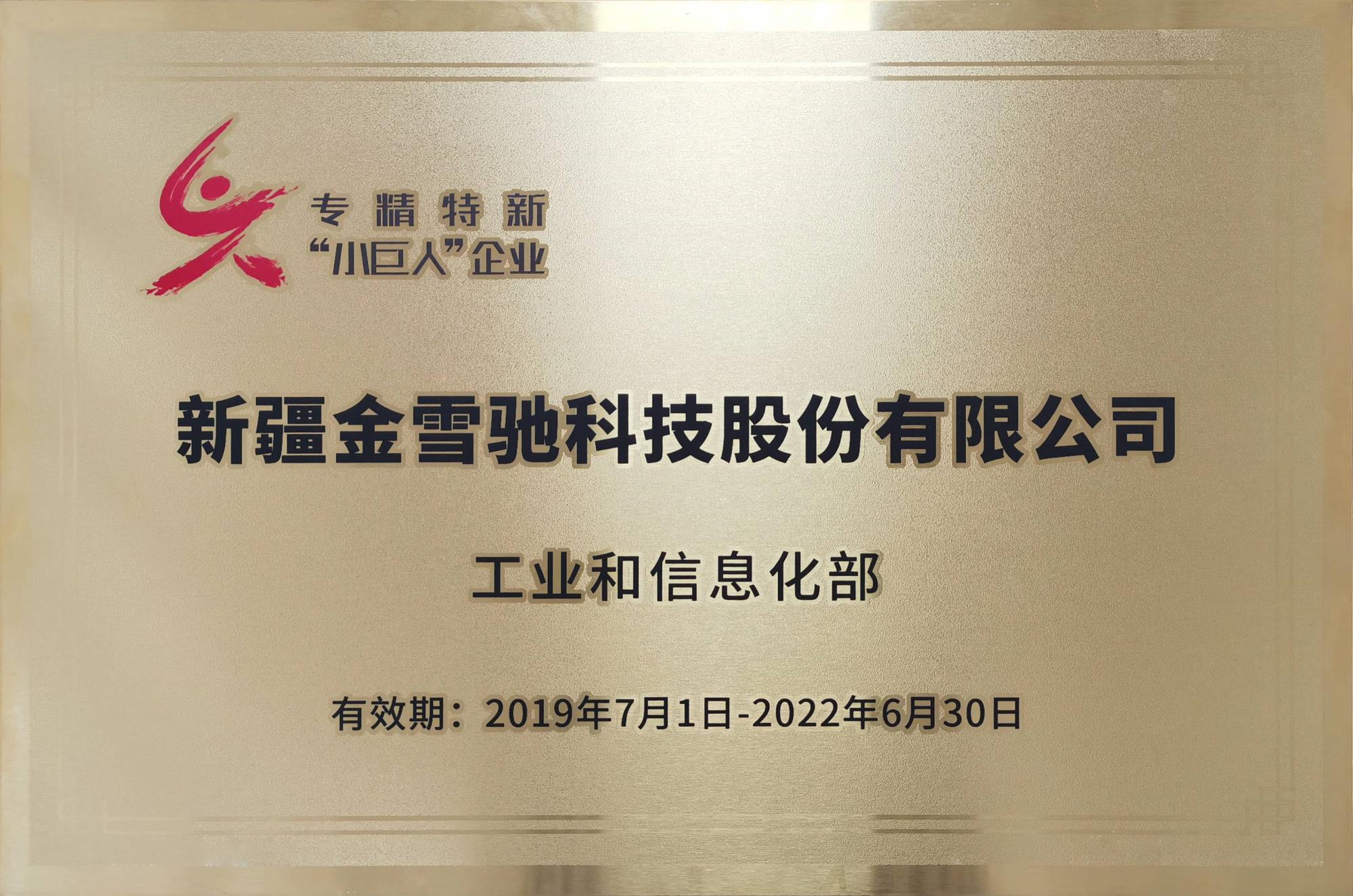 2019年新疆金雪馳科技股份有限公司獲得烏魯木齊市首批市級(jí)“科技小巨人”和“專精特新”企業(yè)榮譽(yù)稱號(hào)。