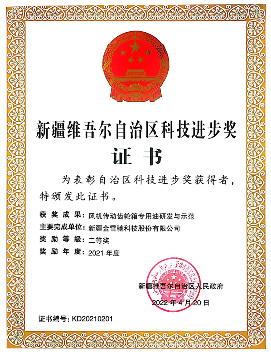 2022年新疆金雪馳科技股份有限公司榮獲“新疆維吾爾自治區(qū)2021年度科技進(jìn)步二等獎(jiǎng)”。