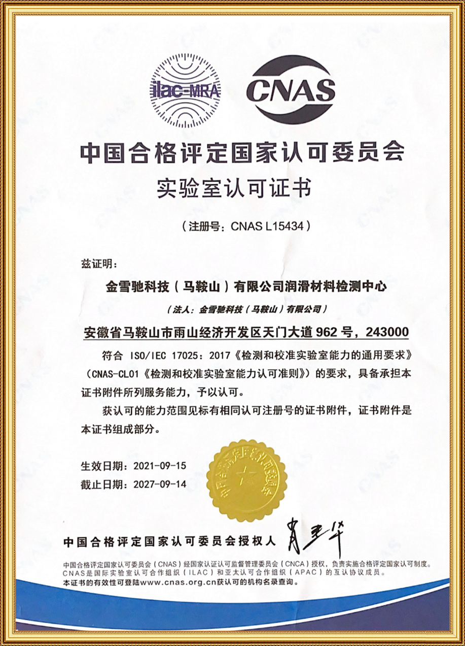 2021年金雪馳科技(馬鞍山)有限公司潤(rùn)滑材料檢測(cè)中心獲得國(guó)家認(rèn)可CNAS實(shí)驗(yàn)室資質(zhì)證書(shū)。
